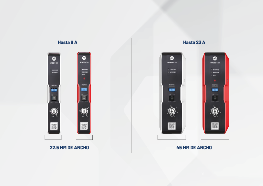 El M100 supera estos desafíos y restricciones al ofrecer capacidades Direct-on-Line (DOL), seguridad e inversión del sentido de rotación, todo dentro del mismo factor de formato.
